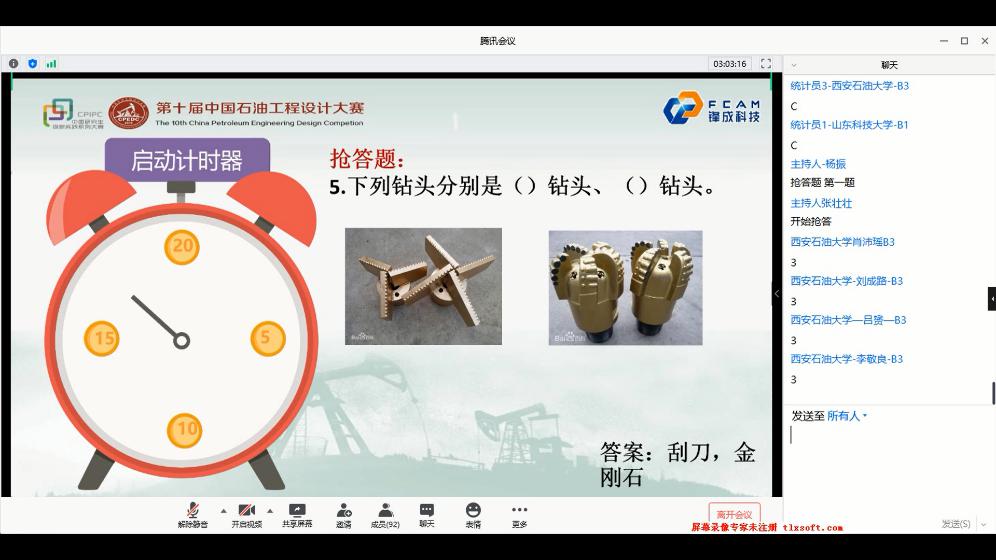 6月13日上午,第十届中国石油工程设计大赛系列活动之“宁波锋成杯”第十届全国石油工程知识竞赛在线开展。中国免费一级毛片(北京)石油工程学院韩国庆教授、中国免费一级毛片(华东)张卫东教授、东北免费一级毛片曹广胜教授、燕山大学李子丰教授担任评委,赞助企业宁波锋成先进能源材料研究院副总经理余波、人力资源总监胡敏参加了活动,来自全国20所高校及科研院所的80名学生线上参加了比赛,500余名师生通过直播观看了比赛。